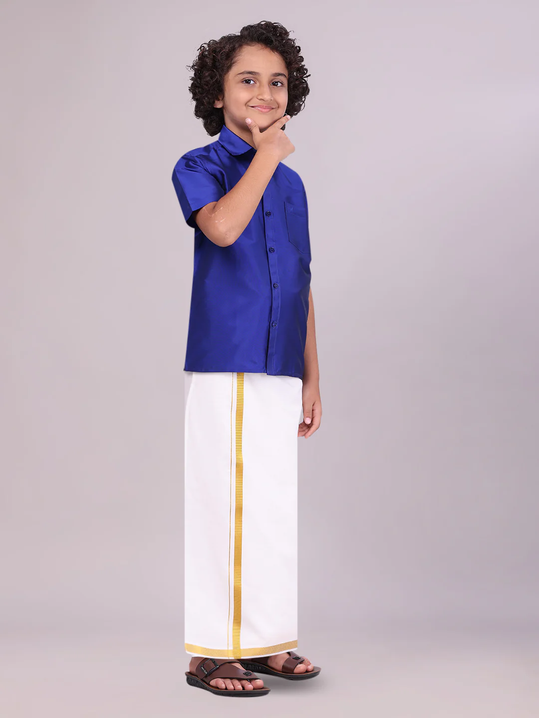 Boys Dupion Satin Blue Half Sleeves Shirt with Gold Jari Flexi Dhoti Towel Combo Calm Boy