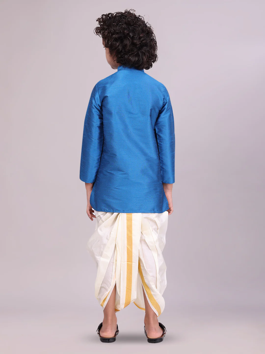 Specification Of Boys Blue Colour Kurtha with Gold Jari Panchakacham Combo Chitrang