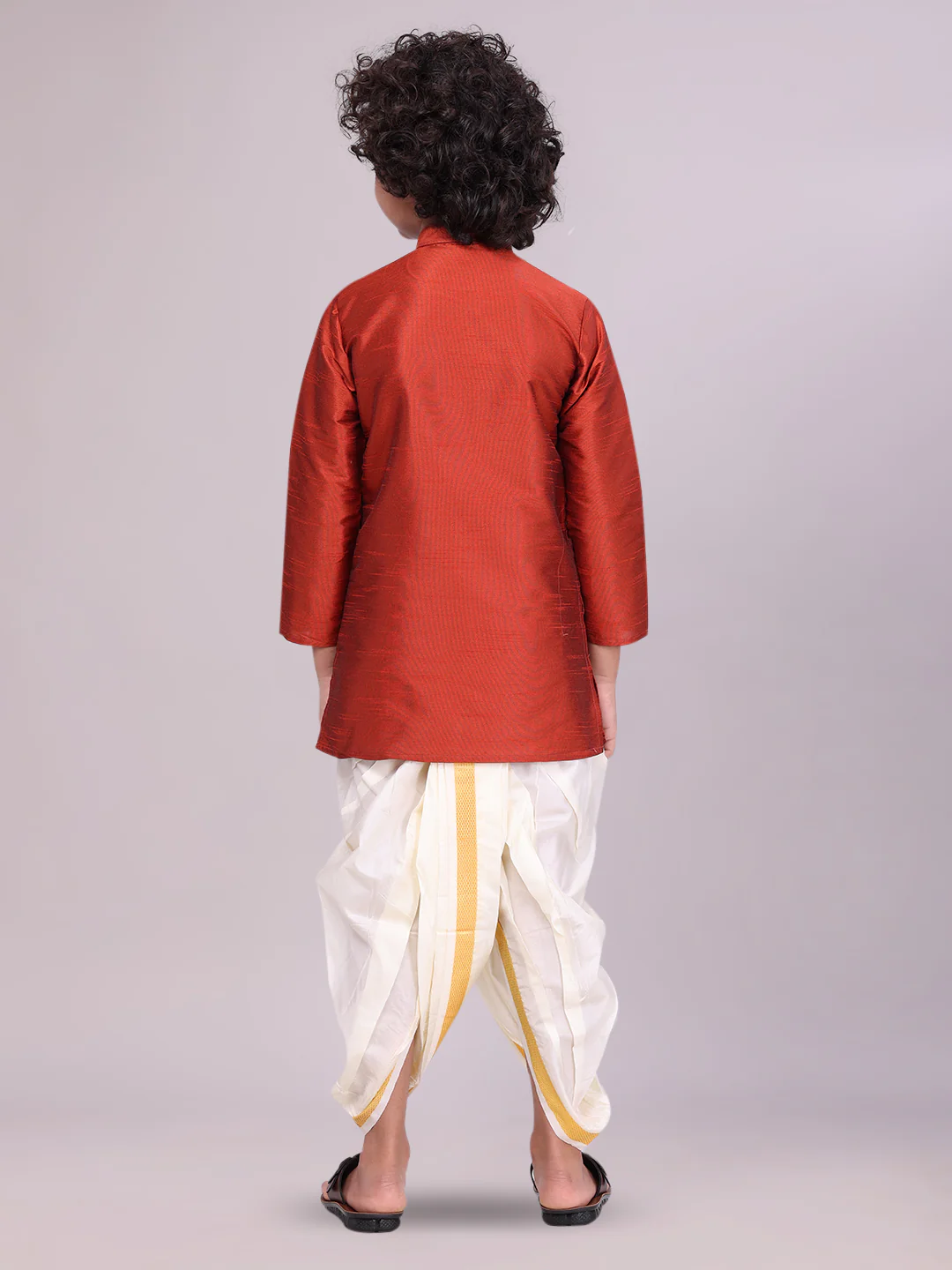 Specification Of Boys Brown Colour Kurtha with Gold Jari Panchakacham Combo Chitrang