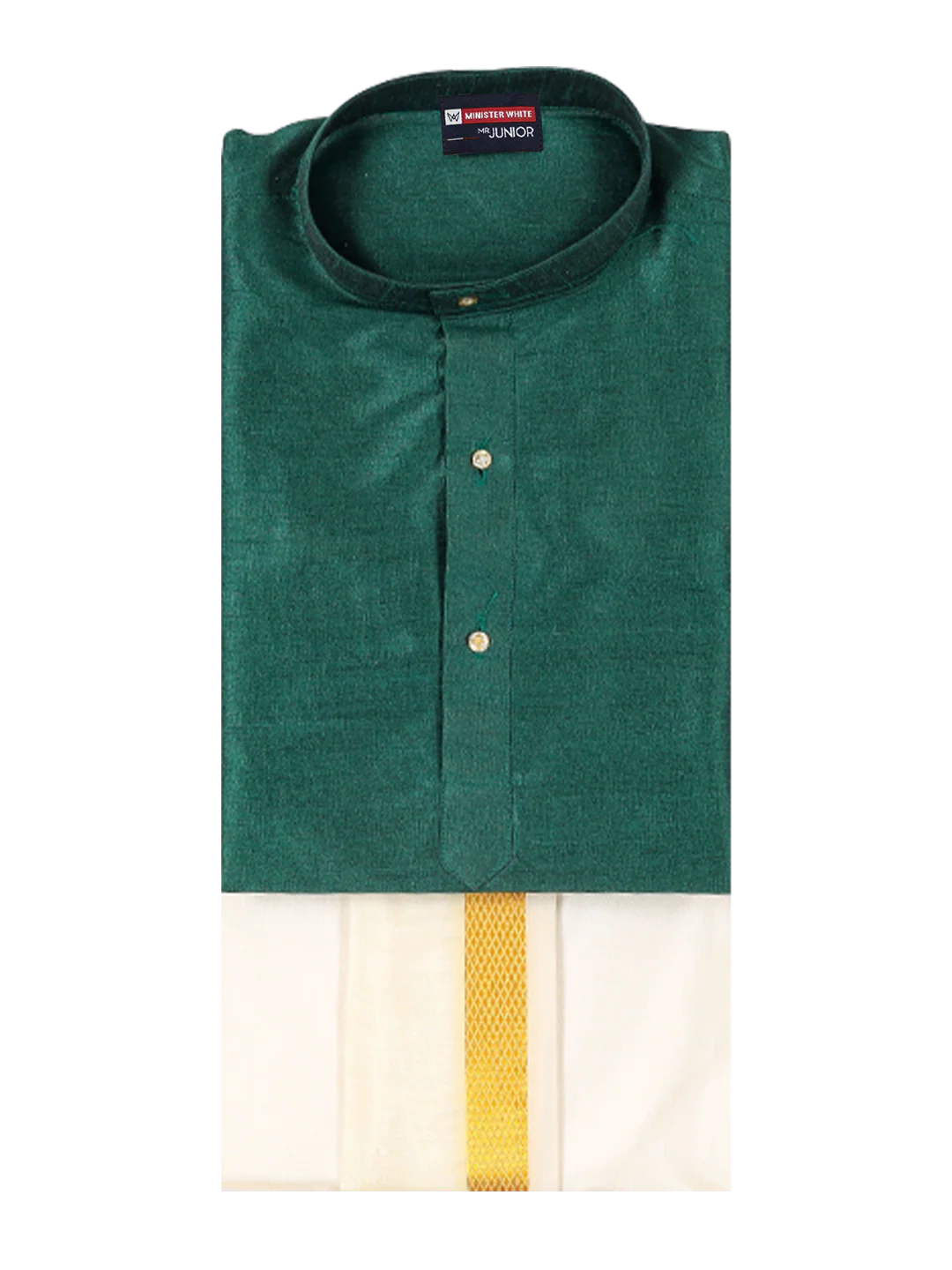 Specification Of Boys Green Colour Kurtha with Gold Jari Panchakacham Combo Chitrang