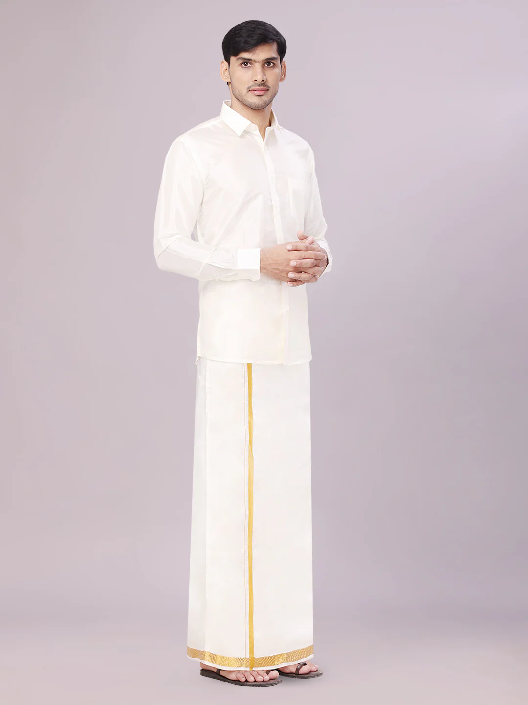 Mens Art Silk Cream Wedding Shirt with Flexi Dhoti and Nerial - Boopalan Flexi