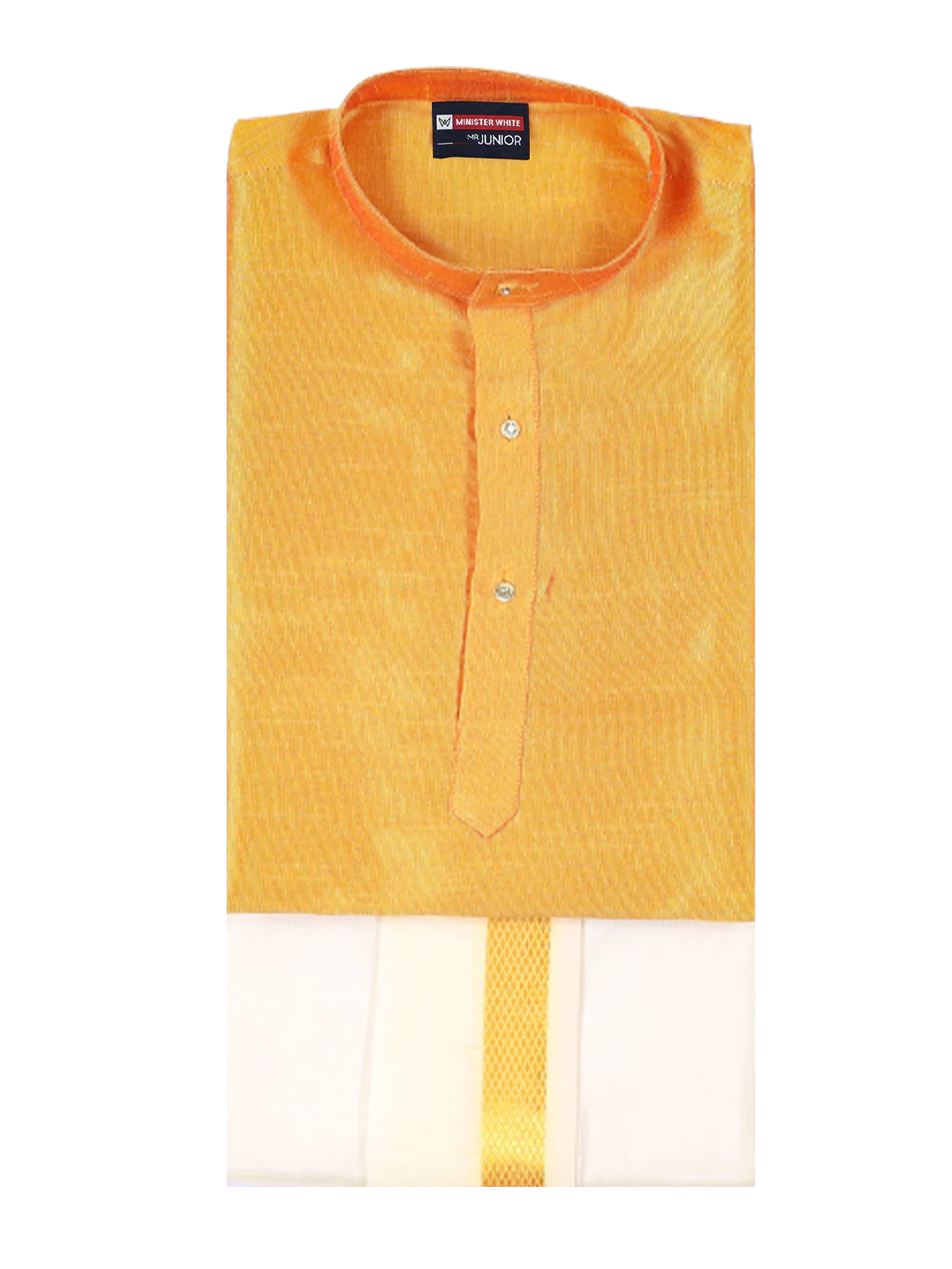 Specification Of Boys Orange Colour Kurtha with Gold Jari Panchakacham Combo Chitrang