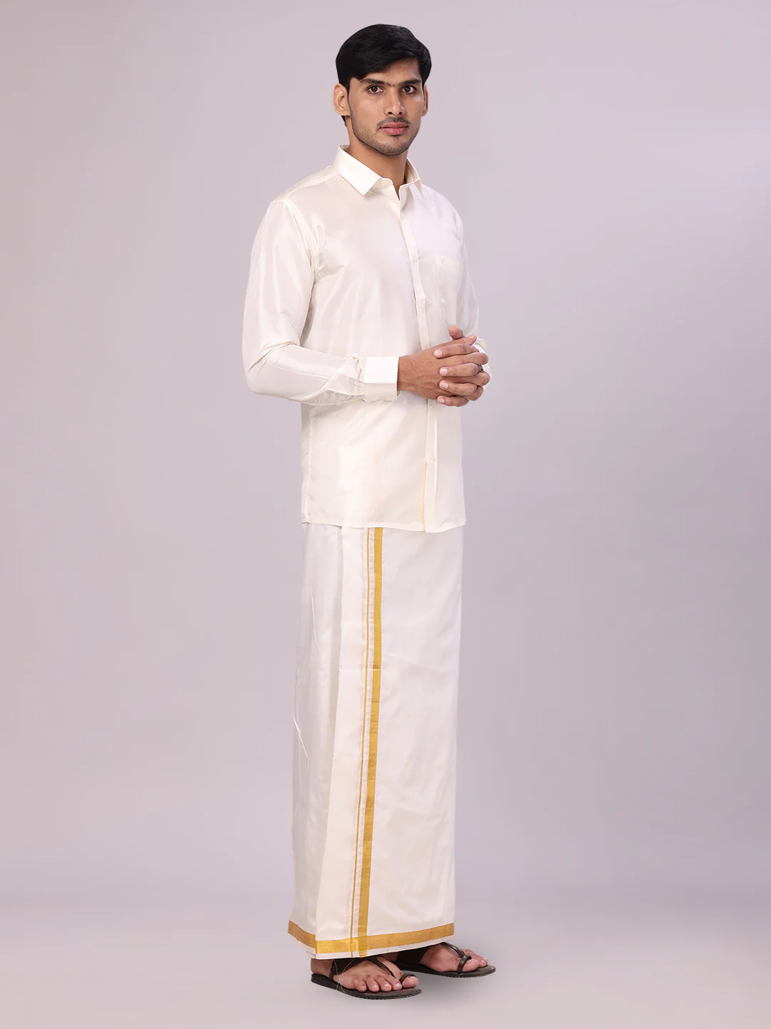Specification Of Men's Pure Silk Wedding Cream Shirt, Dhoti, Nerial with Belt Combo - Nesam 50K