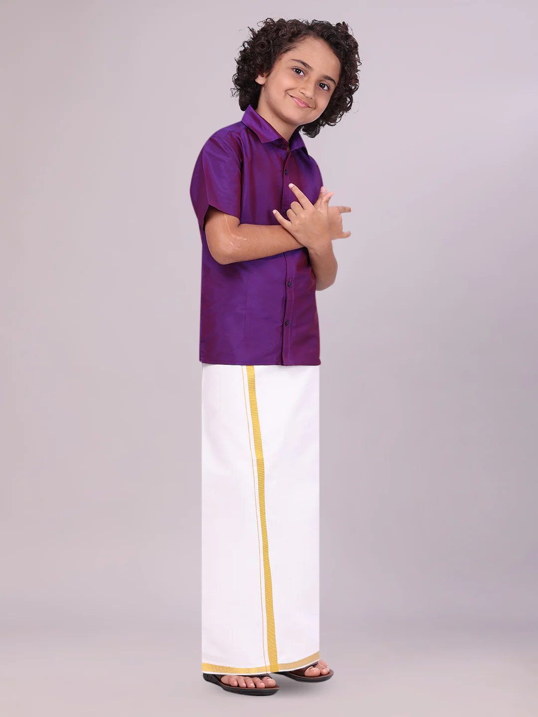 Boys Dupion Satin Purple Half Sleeves Shirt with Gold Jari Flexi Dhoti Towel Combo Calm Boy